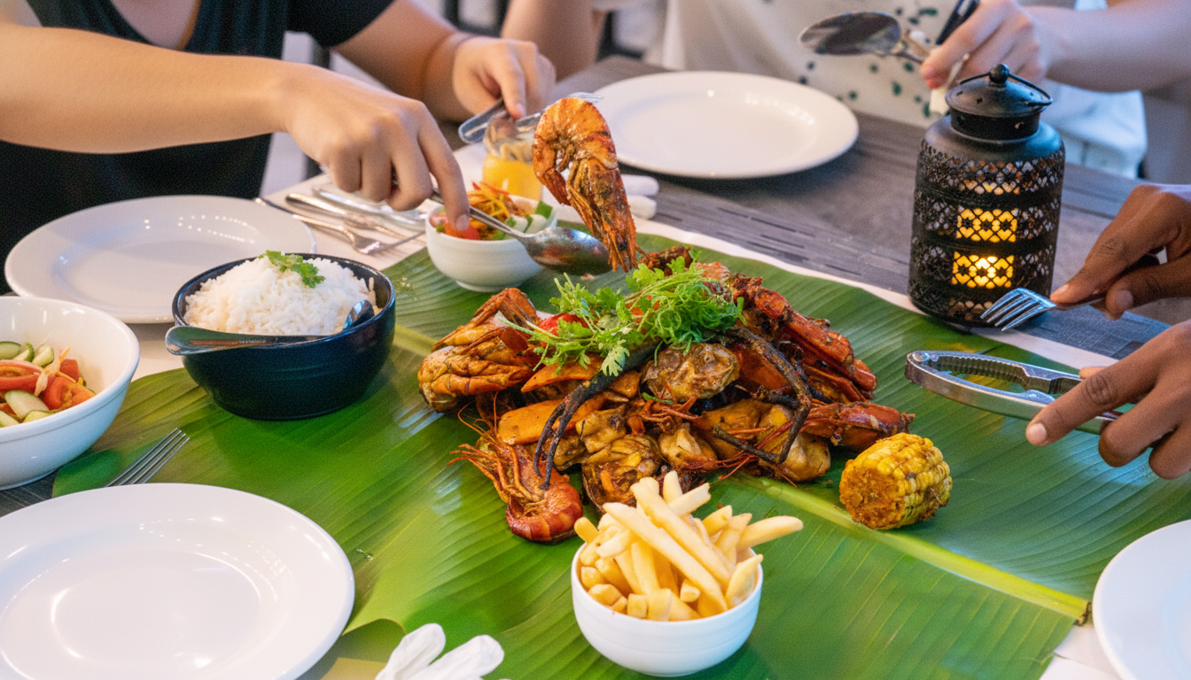 A fresh island-style seafood feast of local mud crab, prawns, walu, mussels and calamari, served with traditional Fijian sides on banana leaves.